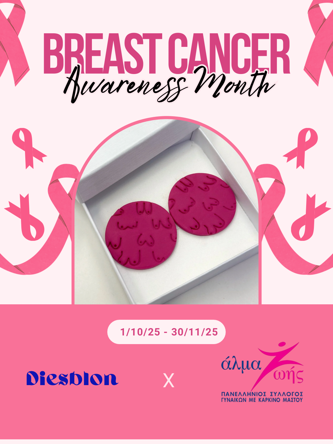 Φέτος θέλουμε να τον κάνουμε ξεχωριστό, γι’ αυτό δημιουργήσαμε δύο μοναδικά ζευγάρια σκουλαρικιών, όπου με κάθε αγορά το 20% των εσόδων θα προσφέρεται στον Πανελλήνιο Σύλλογο Γυναικών με Καρκίνο Μαστού «Άλμα Ζωής».