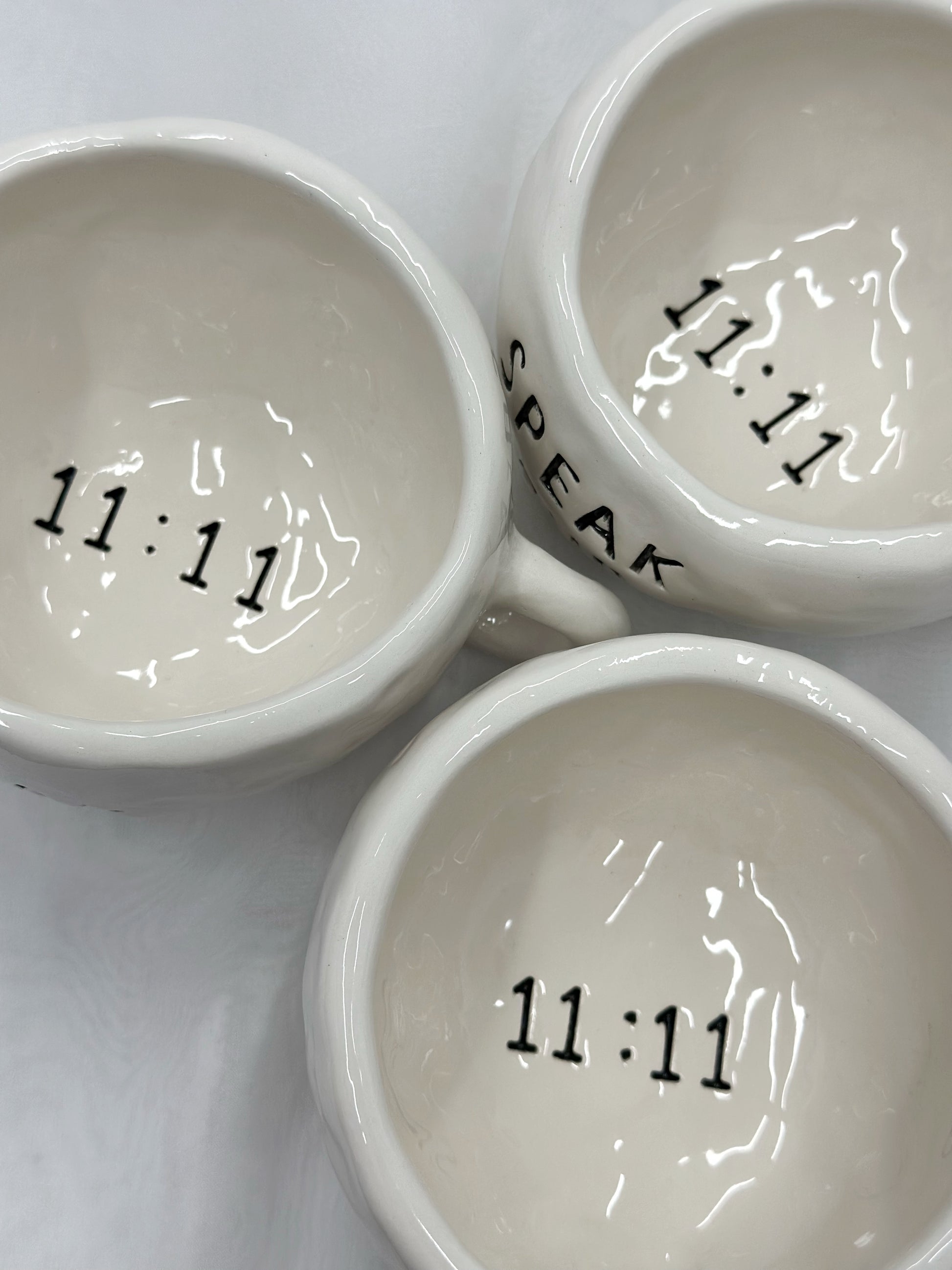 Κάπου ανάμεσα σε μια γουλιά καφέ και ένα βλέμμα στο ρολόι, η μαγεία συμβαίνει. Αυτή η χειροποίητη κούπα με την επιγραφή “speak your wish” και τον αριθμό 11:11 σου ψιθυρίζει πως η στιγμή να κάνεις την ευχή σου… είναι τώρα! 💫