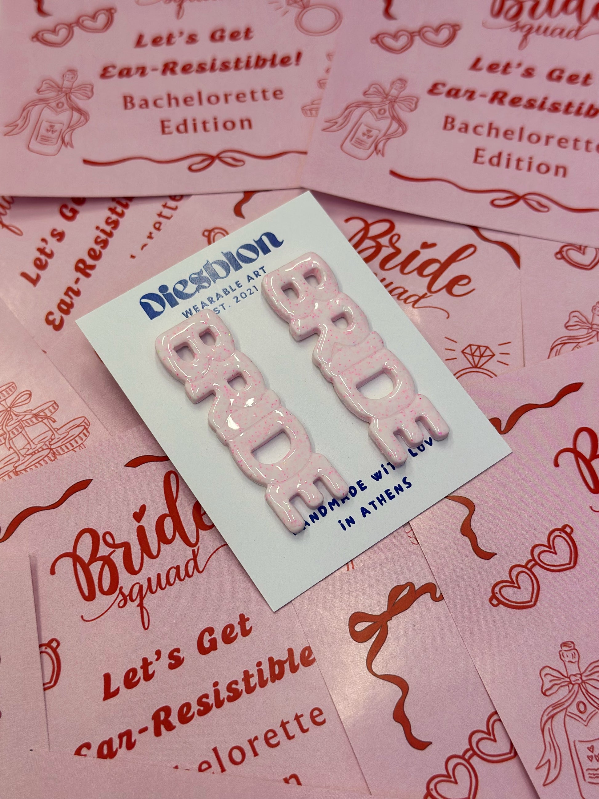 Χειροποίητα σκουλαρίκια με τη λέξη “Bride”, σχεδιασμένα αποκλειστικά για τη μέλλουσα νύφη που θέλει να ξεχωρίζει στο bachelorette, το bridal shower ή ακόμα και την προετοιμασία του γάμου.